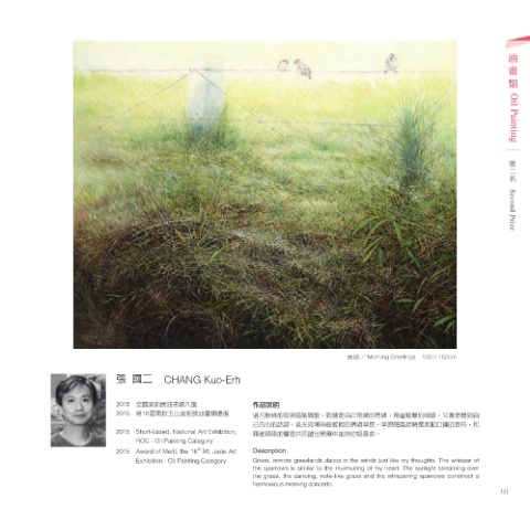2015 第16屆南投玉山美術獎油畫類優選                 遠方鮮綠的草原隨風舞動,就像是自己飛揚的思緒;麻雀輕聲的細語,又像是聽到自