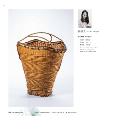 248 249 楊雅雪 YANG Ya-Syue 作品說明 Description ߇ࠬєdဘႀf ίࠬʕdίήɪf ၳϓ਼dЧږಡf Autumn wind blows, leaves dance. In the wind, on the ground. Into piles, like a golden carpet. 優選 Award of Merit ߇จዢĸFeeling the Autumnĸ50Ò40.5Ò40.5cmĸ϶eᚁĸBamboo, Rattan