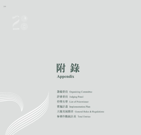 268 269 附 錄 Appendix ᘪ௪։ࡰ Organizing Committee ൙ᄲ։ࡰ Judging Panel ᆤΤఊ List of Prizewinner ྼ݄ࠇ Implementation Plan ɽᄧߕ࢝ᔊ General Rules & Regulations ਞᒄᅰ୕ࠇڌ Total Entries
