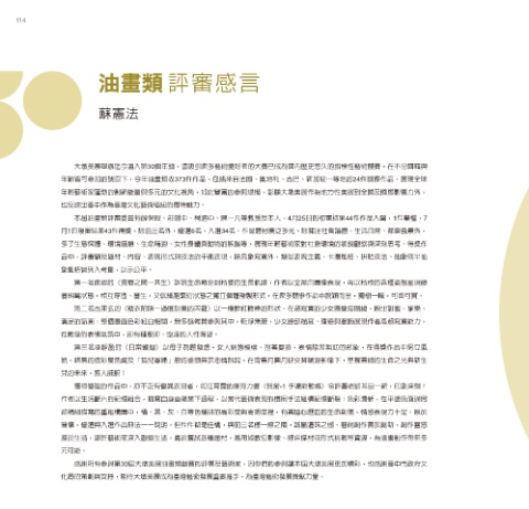 品中,評審顧及題材、內容、表現形式與技法的平衡表現,除具象寫實外,類似表現主義、卡漫風格、拼貼技法、抽象或半抽