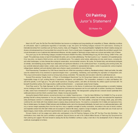 This year’s jury for the Oil Painting Category included Professors HSUEH Pao-Shia, CHUANG Ming-Chung, KO Shih-Chung, CHEN Yi-Fan, and