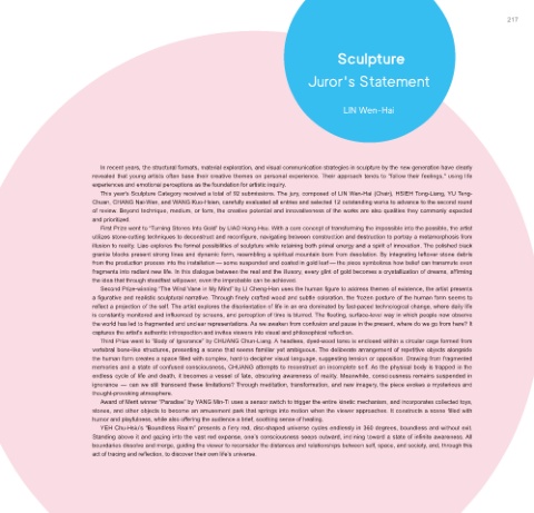 This year's Sculpture Category received a total of 92 submissions. The jury, composed of LIN Wen-Hai (Chair), HSIEH Tong-Liang, YU Teng-