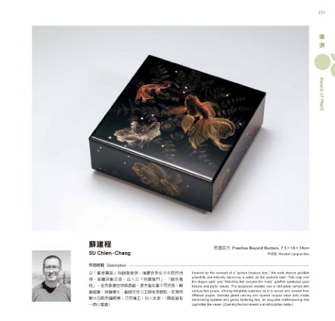 性」,金魚象徵吉祥與逸趣。漆木盒刻畫不同魚態,轉 fortune and joyful leisure. The lacquered wooden box is intricately carved with