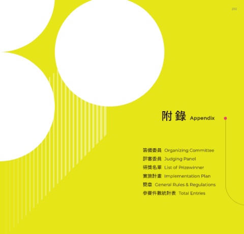253 252 252 253 附 錄 Appendix 籌備委員 Organizing Committee 評審委員 Judging Panel 得獎名單 List of Prizewinner 實施計畫 Implementation Plan 簡章 General Rules & Regulations 參賽件數統計表 Total Entries