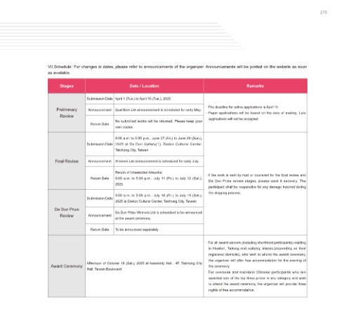 VII.Schedule: For changes in dates, please refer to announcements of the organizer. Announcements will be posted on the website as soon